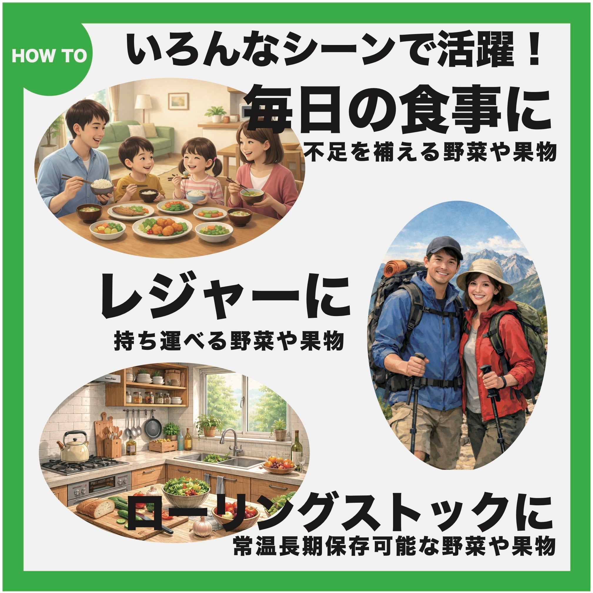 ALL SLOW FOODの乾燥野菜・果物は100%高知県産の新鮮な野菜や果物を洗う・切る・乾燥のシンプルな工程を丁寧に行っています。30℃~50℃の比較的低い温度で時間をかけてじっくし乾燥しているため、素材本来の風味を残し大変美味しく仕上がっています。ブドウ糖コーティングをしていないので、野菜も水で戻さずそのままでもお召し上がりいただけます。日々の生活や災害時に不足しがちな野菜や果物を手軽に美味しく補えるドライフードです。