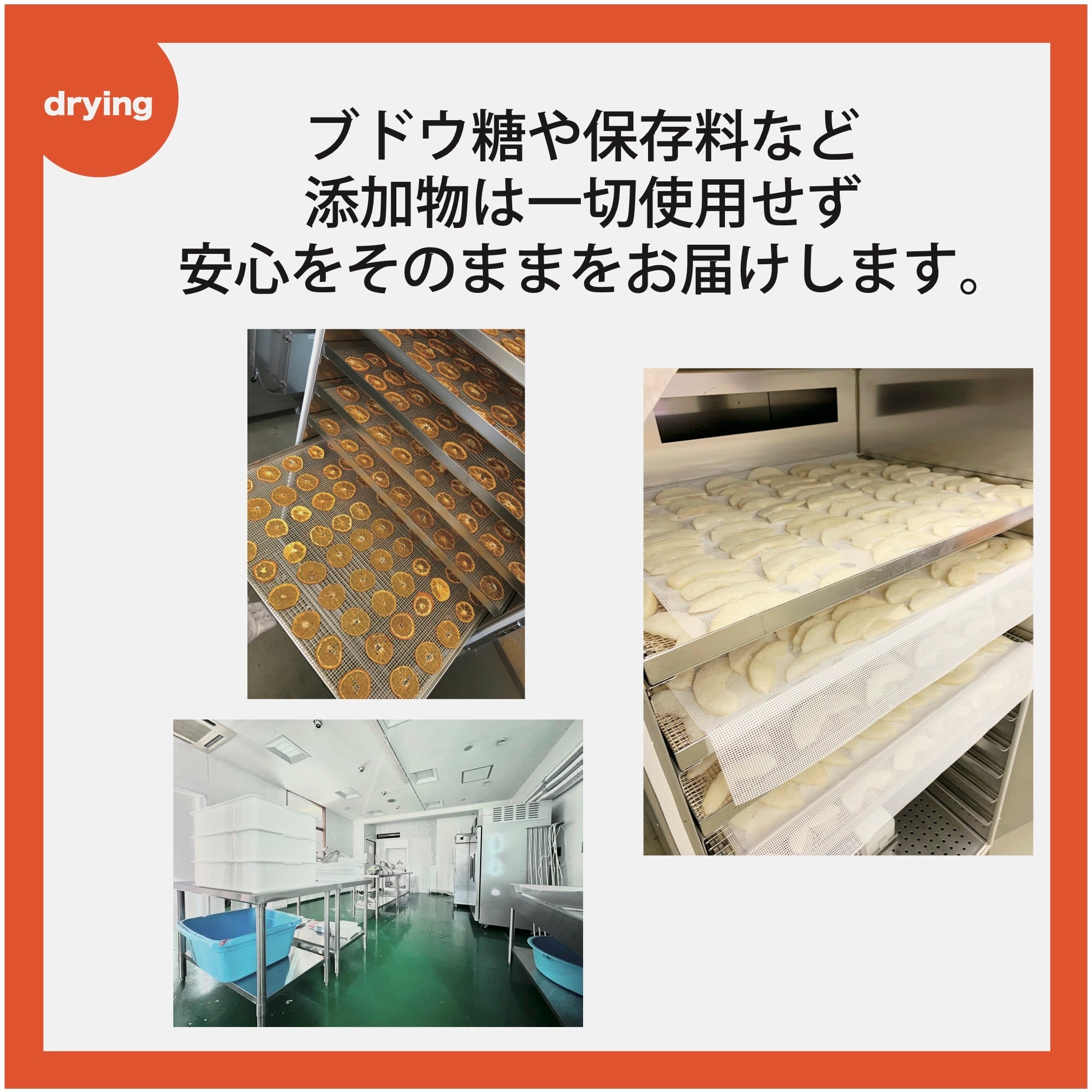 ALL SLOW FOODの乾燥野菜・果物は100%高知県産の新鮮な野菜や果物を洗う・切る・乾燥のシンプルな工程を丁寧に行っています。30℃~50℃の比較的低い温度で時間をかけてじっくし乾燥しているため、素材本来の風味を残し大変美味しく仕上がっています。ブドウ糖コーティングをしていないので、野菜も水で戻さずそのままでもお召し上がりいただけます。日々の生活や災害時に不足しがちな野菜や果物を手軽に美味しく補えるドライフードです。